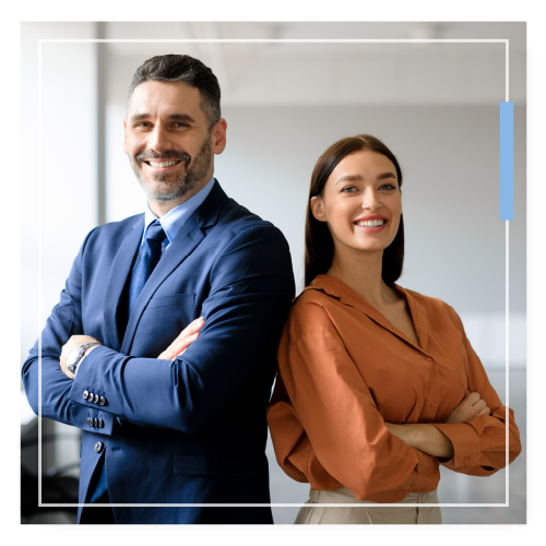 Male and female smiling as they stand back to back with each having their arms folded in front of them.
