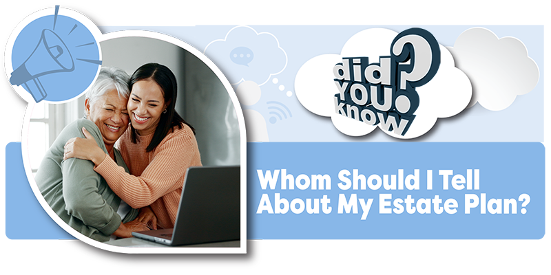 The trick is knowing whom to tell what, when to tell them, why to tell them, and how to tell them. “Telling” someone can mean different things, from giving them copies of all your plan documents and keys to your digital vault to letting them know that they are named in the plan and whom to contact later for more details.